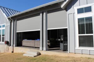 We install most of our motorized screens with a track system that is surface-mounted or recessed into your structure. But if your project is flanked by open corners, or decorative columns, or you want an exterior mounted solar shade, we’ll install your screen using a self-tensioning cable-guide system that doesn’t need posts or tracks.
