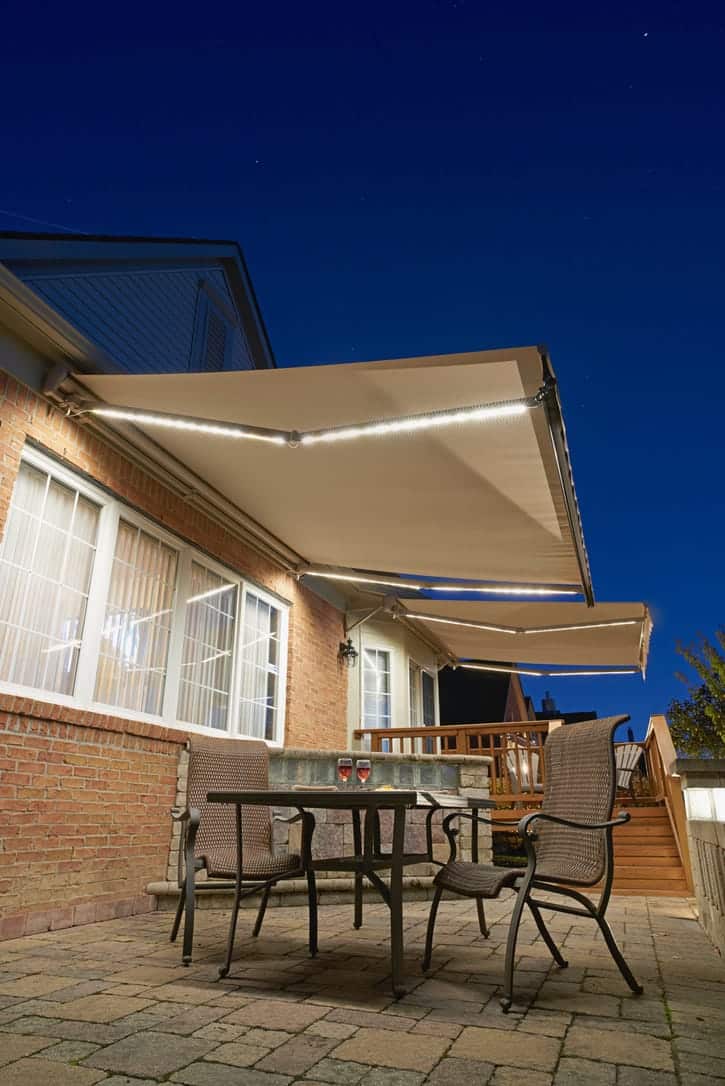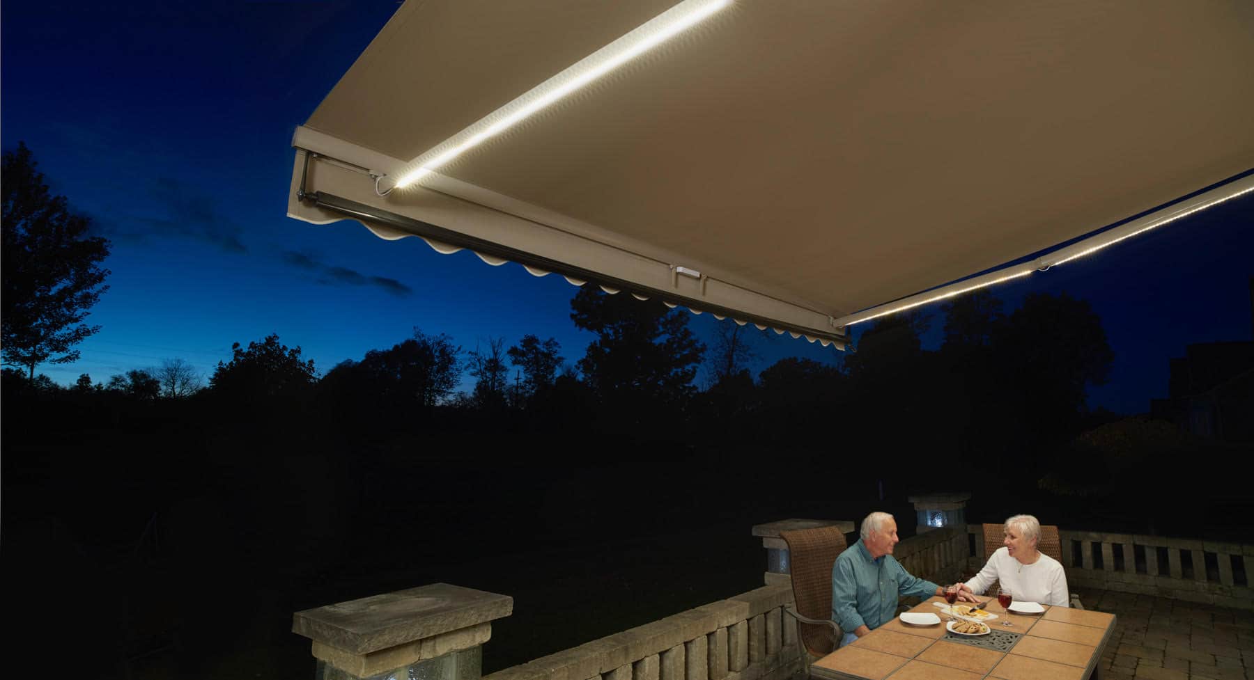 A standard feature on all our awnings is our built-in dimmable LED lights. These lights are cleverly built into the arms of all our awnings, giving users the ability to control the level of light by remote control.